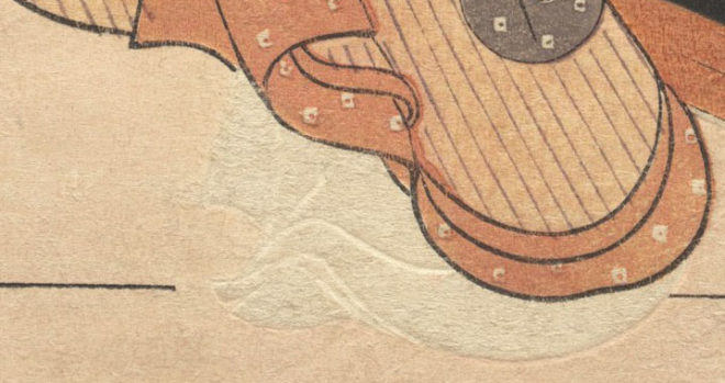 しかし、この少女の足元が見えるでしょうか?よく見ると草履を履いていません。この足元は“空摺”という方法で、版木に紙を押し当てて凹凸で形を表現したものです。