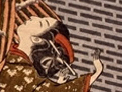ただこの女性、振袖は当時少女と言える年頃の娘が着るものでした。それが煙草を吸うとは、しかも男性からのもらい火とは遊女でしょうか。しかし浮世絵はただ事実を描くものではありませんので、そこをつついても意味はないかも知れません。